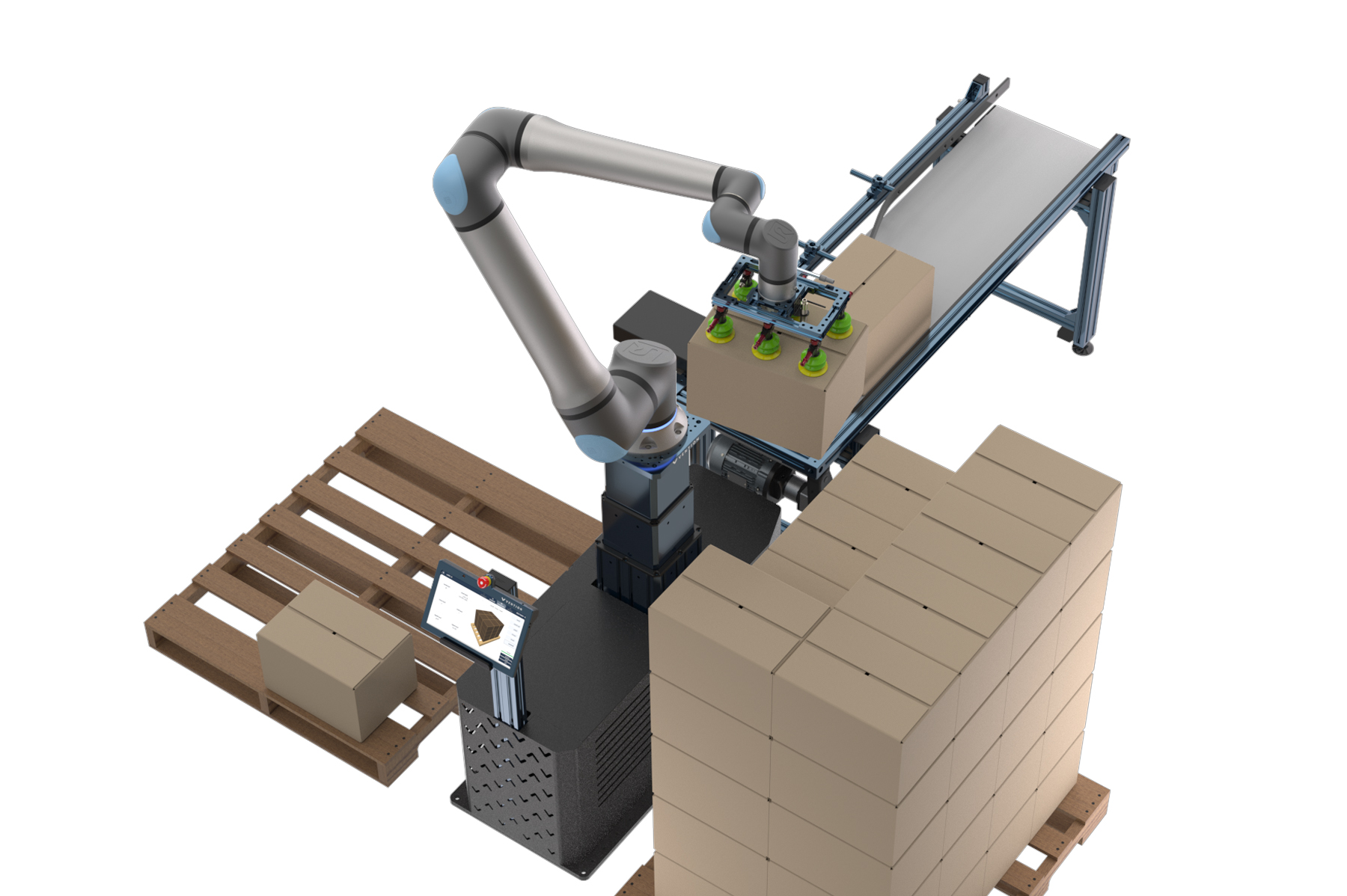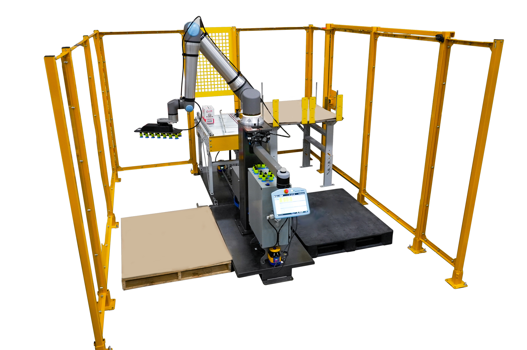 Sử dụng robot cộng tác UR OEM, PalletizUR không có mặt dây chuyền dạy và được điều khiển thông qua một giao diện màn hình cảm ứng duy nhất. Được tải sẵn Phần mềm xếp pallet ONExia Robotics, người dùng cuối có thể tạo, chỉnh sửa và lưu cấu hình pallet mà không cần viết một dòng mã nào.