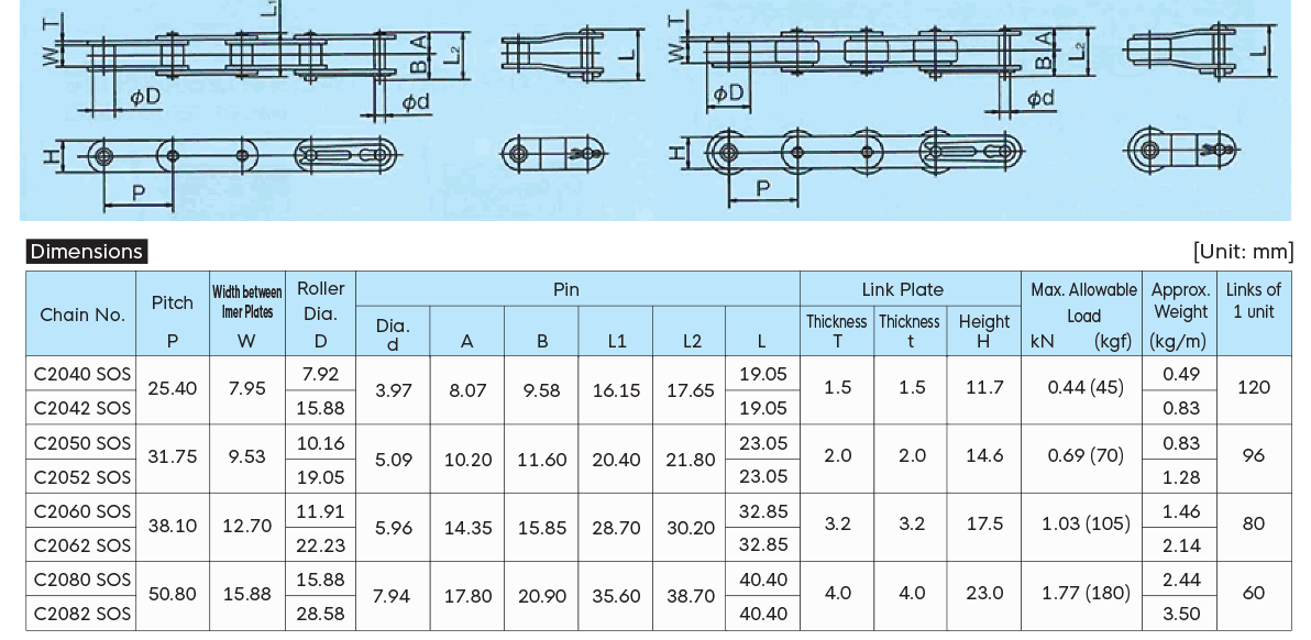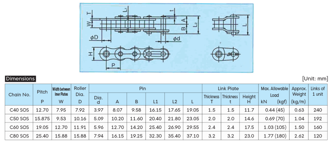 Sử dụng chất bôi trơn đạt chứng nhận NSF-H1 (có thể sử dụng ở nơi có thể vô tình chạm vào thực phẩm), không có vấn đề gì khi sử dụng cho máy thực phẩm. Cũng sản xuất xích SOS với chất bôi trơn công nghiệp tẩm bụi.