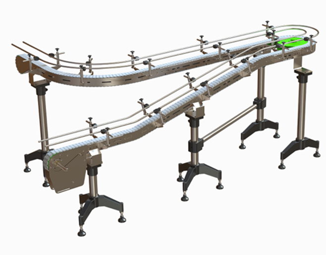 The versatile and versatile HamakyuFlex flat top chain conveyor system features a modular design. Modules and standardized components make it simple and cost-effective to integrate the system into any production process, as well as to adapt and expand it. HamakyuFlex is a conveyor system that develops according to your requirements. Furthermore, it is compatible with systems currently available on the market. The single track design and curvature radius starting from 150 mm allow for complex track design in three dimensions. The chain runs on a wear compensation pad to ensure low wear and can be operated at speeds of up to 50m/min and system lengths of up to 40m with just one drive unit.